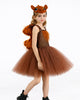 The costume includes a brown animal-inspired dress with a soft tulle skirt, a fluffy squirrel tail, and a matching ear headband. Designed for comfort and easy wear, it suits both indoor and outdoor activities.