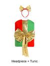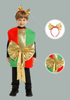 The tunic-style costume features bold festive colours with an attached bow detail, paired with a matching headpiece for a complete and eye-catching look. The relaxed fit makes it easy for children to wear over regular clothes, ensuring comfort throughout the day.