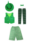The set includes a green vest, matching bow tie, plaid pants, striped stockings and a classic leprechaun hat. The coordinated design creates a complete Irish look that stands out at any celebration.