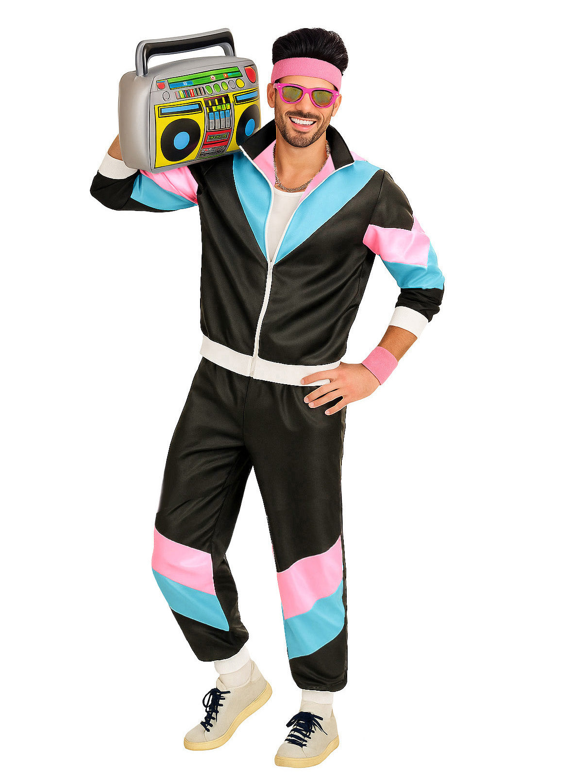 Shell suits were really popular in the 80s. They were far more than just going to the gym. More like a lifestyle choice. This vintage tracksuit is a great choice for an 80's costume. The hot pink and aqua trimming is a lovely contrast with the shiny black of the rest of the suit. This two-piece 80s shell suit comes in three sizes, M, L and XL. It will look great when teamed with a matching headband and a tennis racquet as a prop. Get a matching shiny 80s shell suit for women and you___l be the grooviest 80s couple.