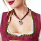 This German beer maid costume is designed from a pretty pink floral dress. This women's Oktoberfest costume, known as a Dirndl is available in 5 sizes from S to 2 XL. This German beer maid outfit consists of a dress, a white short-sleeved t-shirt top, a pink satin embroidered apron. Unlike some of the other Dirndl, this is one that is modest and would suit someone who wanted to look like an authentic German woman in this costume. which is not too short. There is beautiful corset-style lacing on the bodice. We call this lady Oktoberfest costume, the Heidi Beer Maid because of its innocence.