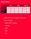 The costume comes in the traditional Blue Colour of the British RAF and includes the Jacket, Trousers, Hat and Tie.