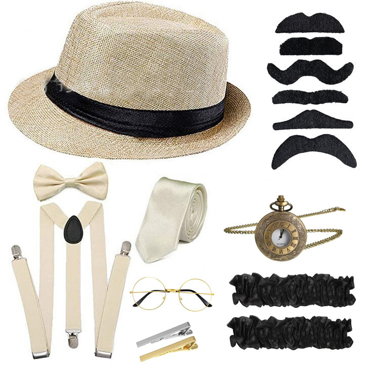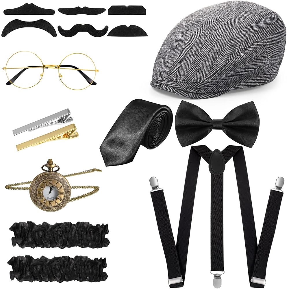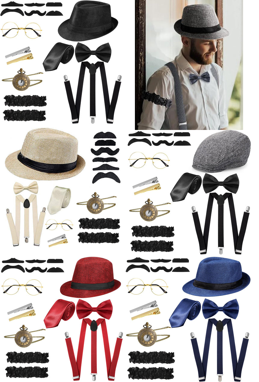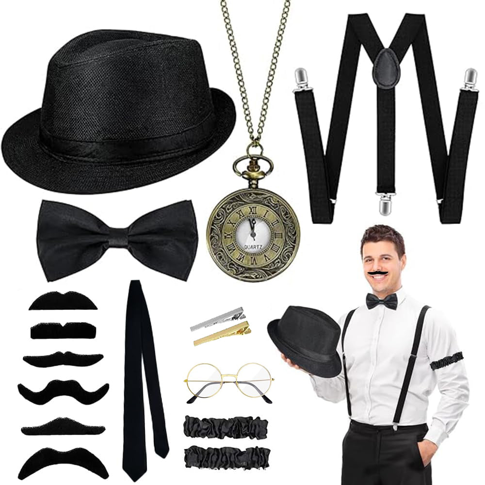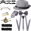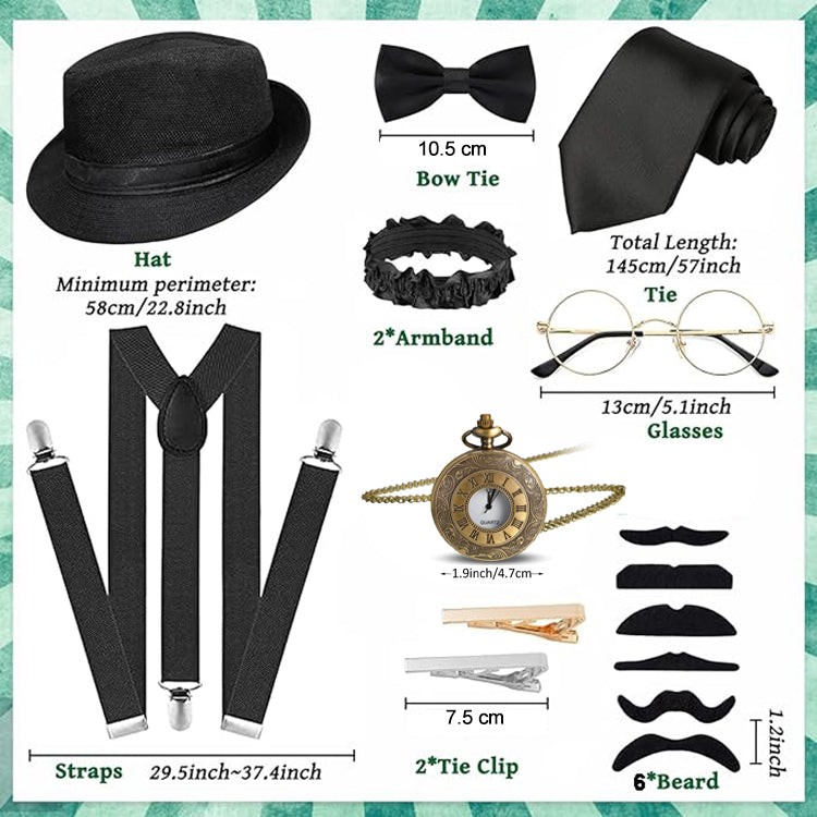 Perfect for Book Week and vintage dress-up events, this 1920s Gentleman Accessories Kit provides everything needed to complete a classic gangster or Roaring 20s gentleman look. The set includes a fedora-style hat, suspenders, tie, bow tie and additional accessories to help create a polished and authentic appearance.
