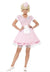 Our Women's 50's Diner Girl Costume includes a short pink and white dress with an attached white apron and a printed name badge on the bust. Completing this look is a matching mini pink hat.