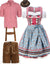 Get Couple Lederhosen Oktoberfest Beer Garden Costume as a pre-packaged set to simplify your life. This wonderful pre-selected couples costume includes more traditional lederhosen and dirndl. These plus size Oktoberfest costumes are available in Australia for immediate delivery. This package includes brown lederhosen for men with pink check shirts complete with a black hat. The matching women's beer maid costume has the same check pink skirt and bodice with a beautiful blue floral apron with a large flowing bow feature. The red bodice ribbon on the women's dirndl is striking over the top of the short sleeve, low cut blouse.