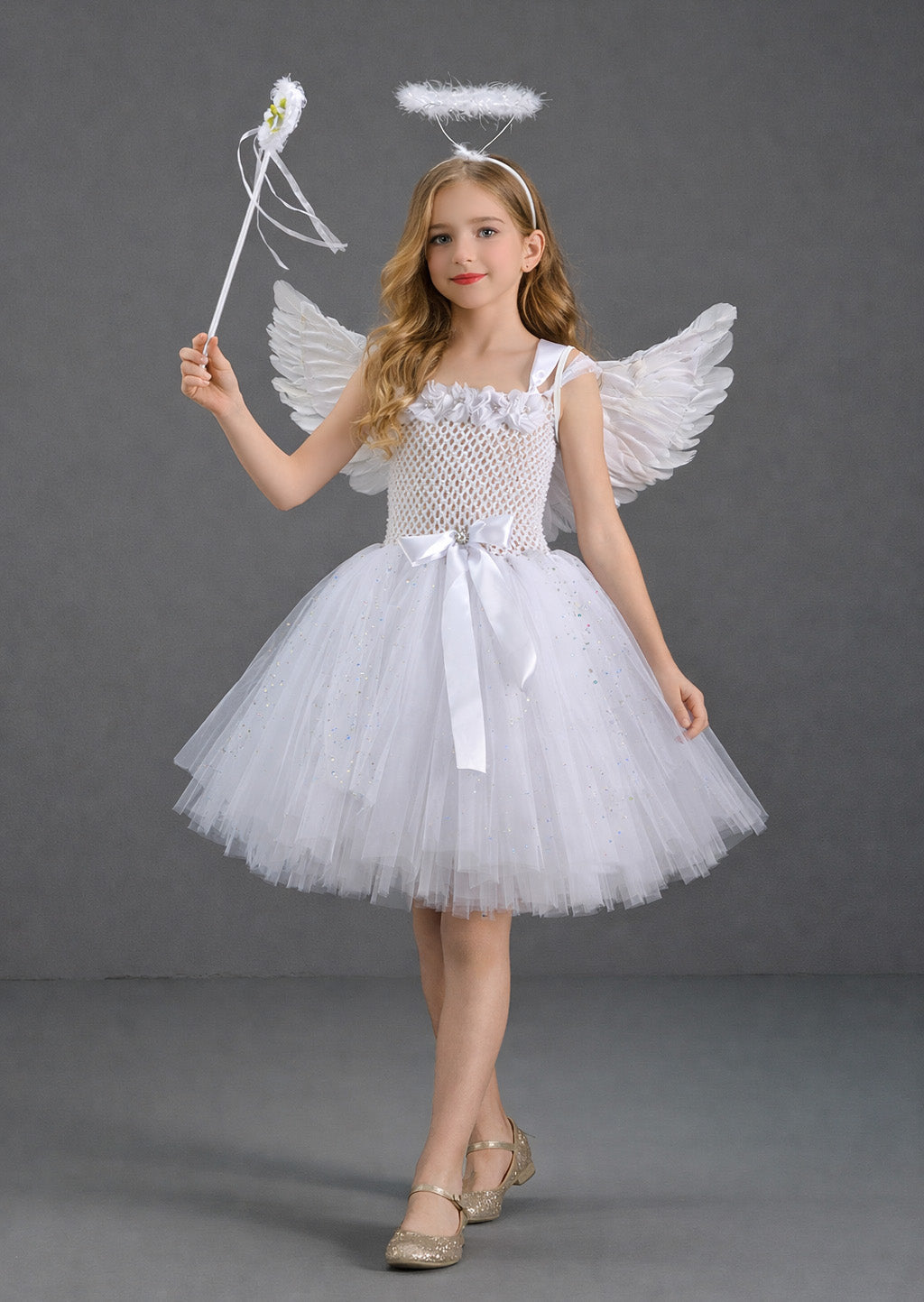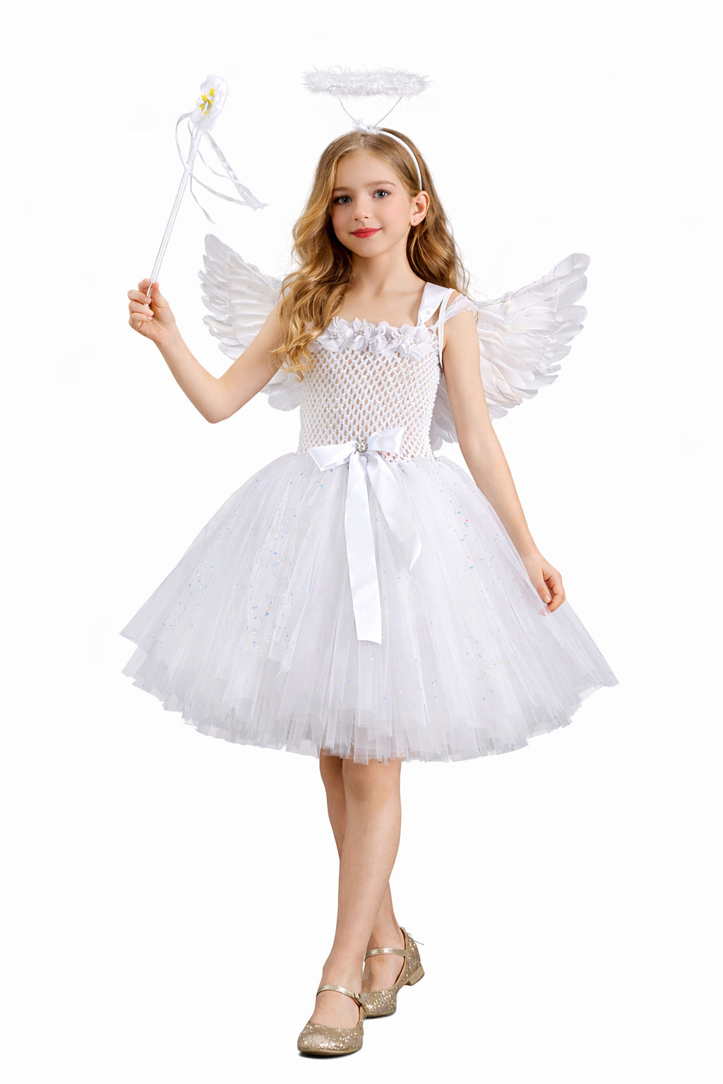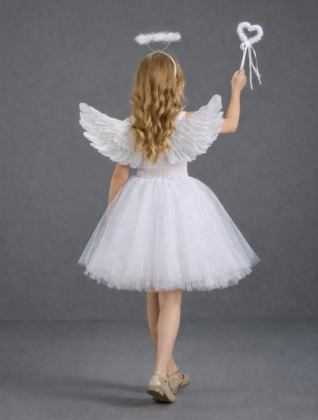 The dress includes a soft mesh bodice with decorative details and a full layered tulle skirt that flows beautifully when worn. The lightweight wings are easy to wear and give the costume a graceful angel-inspired finish.