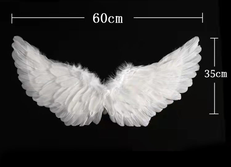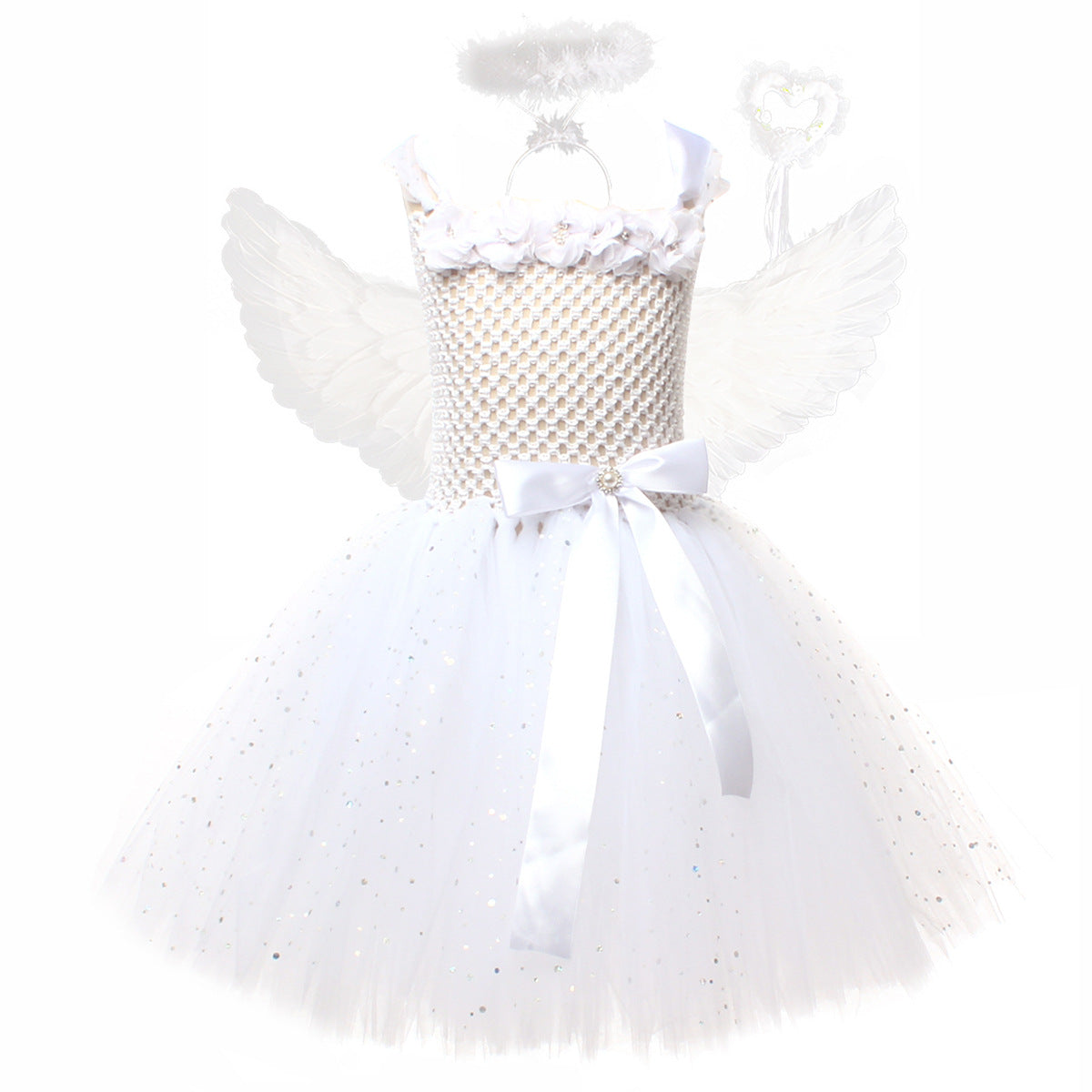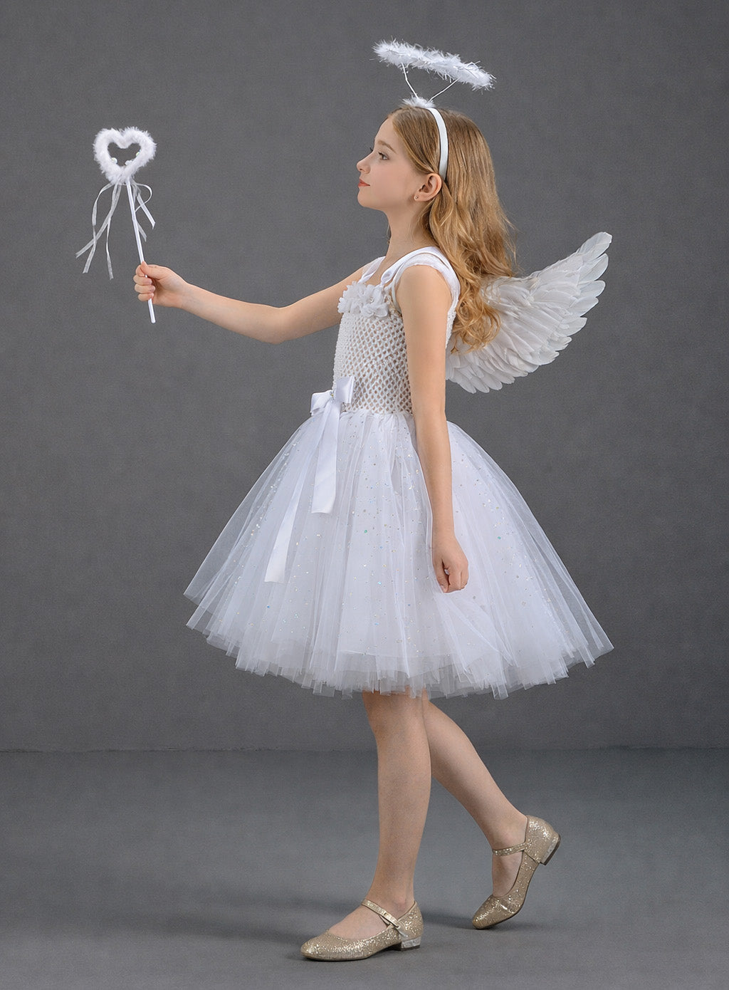 The dress includes a soft mesh bodice with decorative details and a full layered tulle skirt that flows beautifully when worn. The lightweight wings are easy to wear and give the costume a graceful angel-inspired finish.