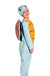 - Light blue fleece-feel jumpsuit with yellow chest and brown shell pattern