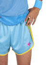 - Electric blue sports shorts with yellow trim and metallic pink Ken Logo