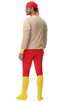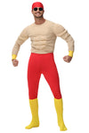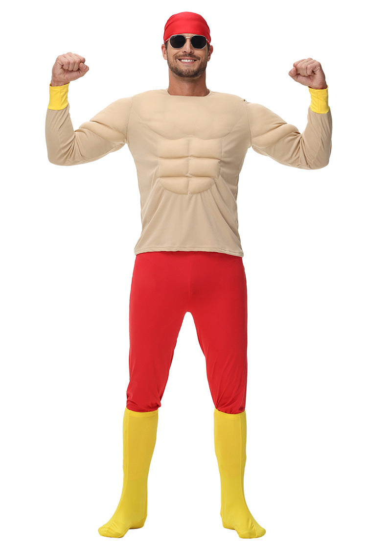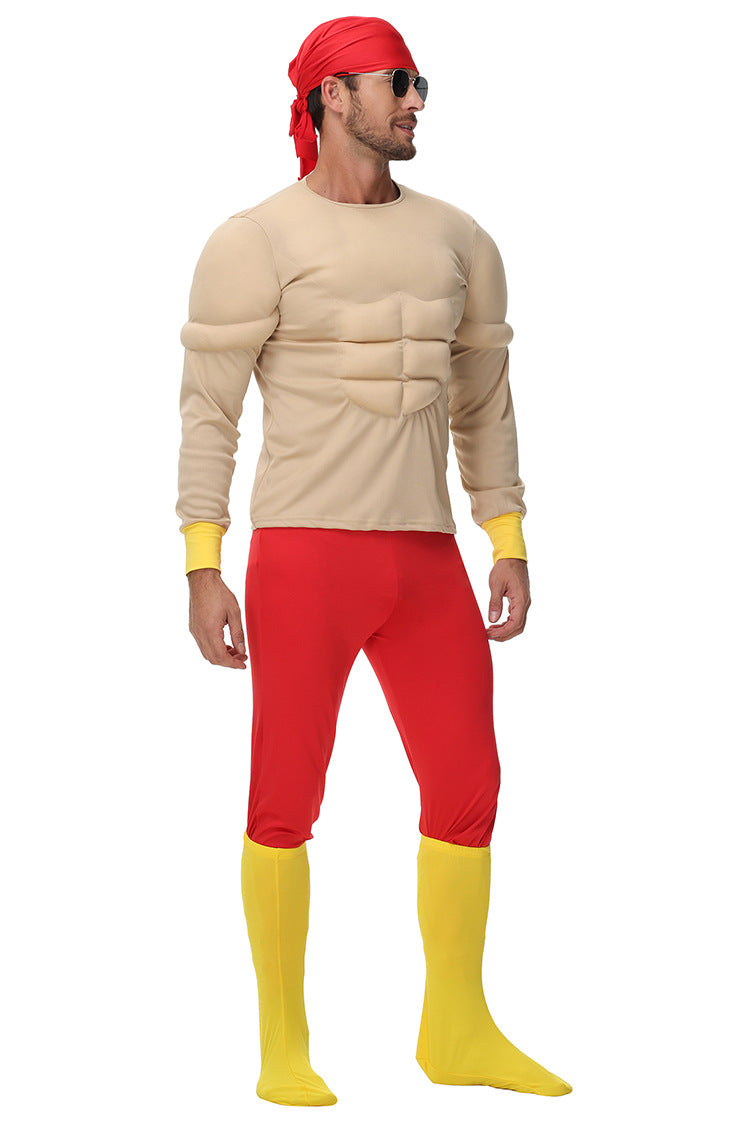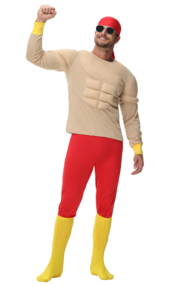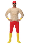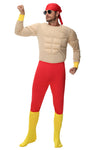 This Mens Muscle Man Costume is designed for Halloween and themed parties, featuring a padded muscle top that creates a strong superhero-style look. The costume includes red fitted pants, a head scarf and yellow foot covers for a complete exaggerated strongman appearance.